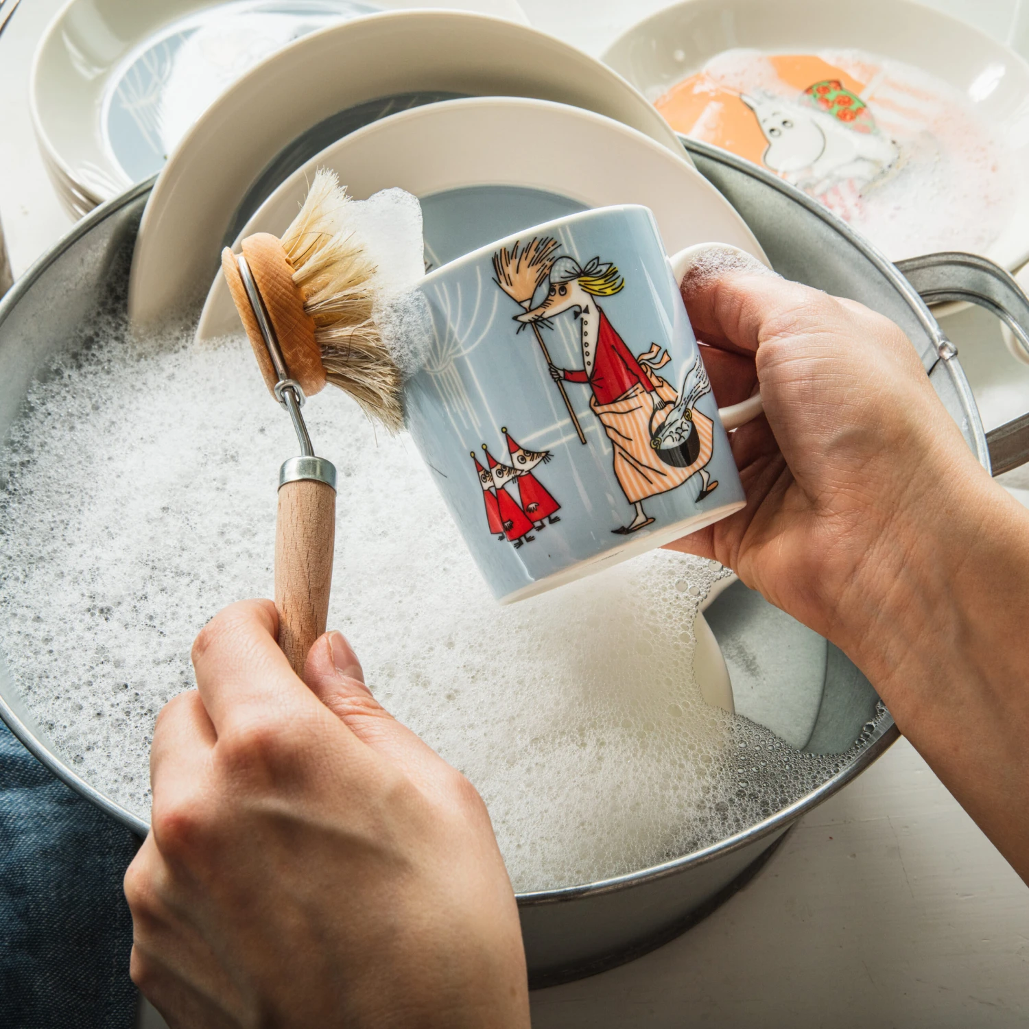 De Moominmokken in duurzaam vitroporselein van Arabia zijn populaire verzamelobjecten die net zo geschikt zijn voor de ochtendkoffie met het gezin als een gezellig koffiemomentje met vrienden.